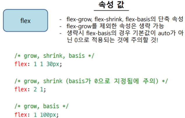 | flex-basis | flex-grow, flex-shrink, flex-basis의 단축 속성 (기본값 auto) |