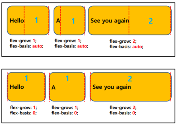 | flex-grow | flex item의 증가 너비 비율을 설정 (기본값 0) |