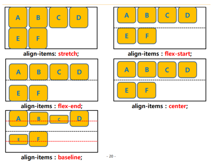 | align-items | 교차 축에서 items의 정렬 방법을 설정 (1줄) |