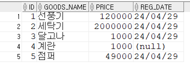 ('점퍼', 5, sysdate, '49000'); -- '100' 문자열이어도 숫자형태면 암묵적 형변환