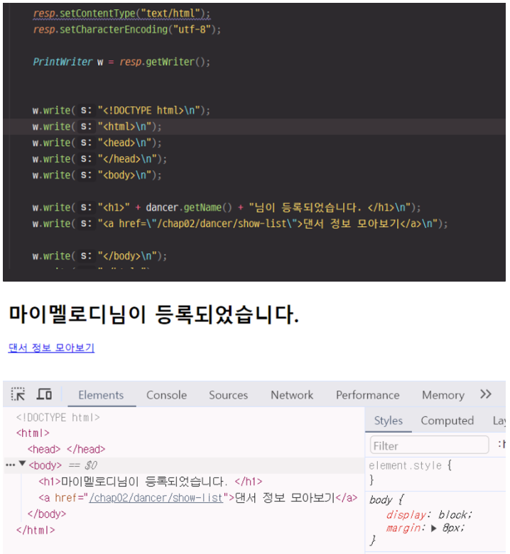 - PrintWriter, w.write으로 html 코드 직접 작성해서 응답 메시지 작성