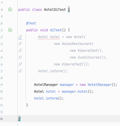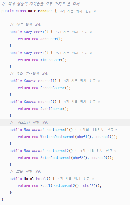 - 각 클래스의 객체 생성은 외부(HotelManager) 클래스로 분리