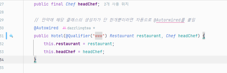 ** @Component(”www”) 별칭 지정, @Qualifier 사용 예시