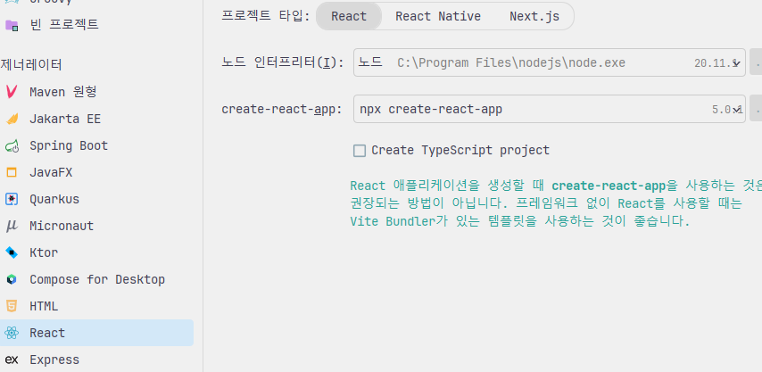 - node.js, npm 먼저 설치되어 있어야 하므로 -v로 버전이 잘 출력되면 react 설치 진행